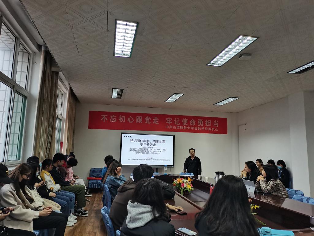 77779193永利2020-2021学年第二学期第2期学术沙龙活动于2021年04月06日晚在公司会议室如期举行。本次沙龙主题为“延迟退休年龄、内生生育率与养老金”,由2020级保险专硕谭骁同学作为主讲人来为大家进行汇报讲解。此次学术沙龙很荣幸邀请到王华丽老师、闫丽瑞老师来担任讲评嘉宾。现场参加学术沙龙的有近80位来自77779193永利各专业、各年级的研究生同学,现场气氛十分活跃。