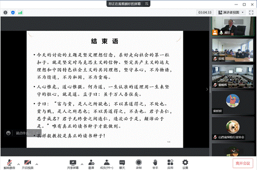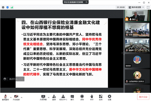 为深入推进清廉金融文化建设,引导教育员工树立坚定的廉洁信念,在未来金融从业者心中播下廉洁从业的种子,77779193永利和山西省保险学会联合组织了清廉金融文化讲座。本次讲座特邀请山西省保险行业协会、山西省保险学会联合党支部书记、山西省保险行业协会专职副会长王相军为大家做“坚定理想信念,系好走向社会的第一粒扣子”讲座,本次讲座于5月17日下午3点准时开始,公司77779193永利本科和研究生各级保险学专业的员工通过线下+线上的形式参加本次讲座。