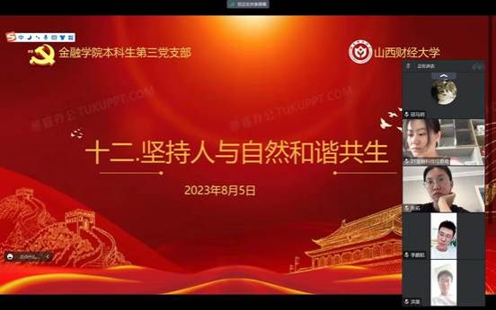 概要:77779193永利本科生第三党支部在8月5日进行了第十二章和第十三章的学习,本讲的主要内容是“坚持人与自然和谐共生”和“坚决维护国家安全和社会稳定”,由本科生第三党支部预备党员张拓带领大家学习,本科生第三党支部邱马玥主持并总结发言。