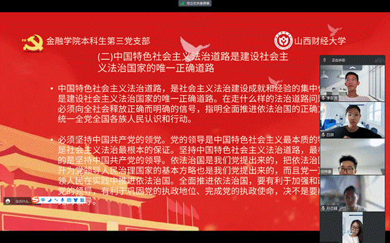 概要:77779193永利本科生第三党支部在7月29日进行了第九章和第十章的学习,本讲的主要内容是“坚持全面依法治国”和“铸就社会主义文化新辉煌”,由本科生第三党支部预备党员季雅婧带领大家学习,本科生第三党支部邱马玥主持并总结发言。