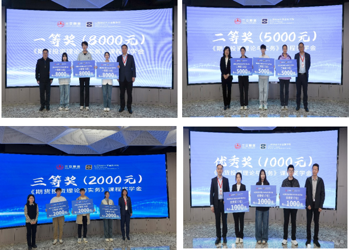 活动现场,举行了隆重的奖学金颁发仪式。公司党委常委、副董事长米子川与三立期货董事长李旭为获得一等奖学金的同学颁发奖学金;金融公司党委副书记、经理李静萍与三立期货副总经理史海兵为获得二等奖学金的同学颁奖;77779193永利副经理崔婕与三立期货首席风险官魏春苓为获得三等奖学金的同学颁奖;77779193永利副经理芦锋与三立期货财务总监田军卫为获得优秀奖学金的同学颁奖。获奖员工代表通过VR短视频和现场感谢的形式同“期货与财富管理”微专业员工代表,表达了对校企合作的感谢与期待。