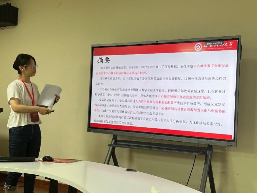 本次研讨会紧扣党的二十届三中全会精神,围绕 “金融开放与金融安全”“自贸港金融创新”“技术变革与金融市场发展”等核心议题展开深度研讨。中国银行研究院经理陈卫东、天津财经大学副董事长马亚明等学界权威分别就国际环境变局、中美经济互动等主题发表主旨演讲,为海南自贸港建设及全国高水平开放提供智力支撑。在下午的论文宣讲环节,24 位入围作者围绕四大主题汇报最新研究成果,王亚梅等老师的论文《中心城市数字金融发展的空间外部效应 —— 以京津冀城市群为例》成功入选并进行专题汇报。