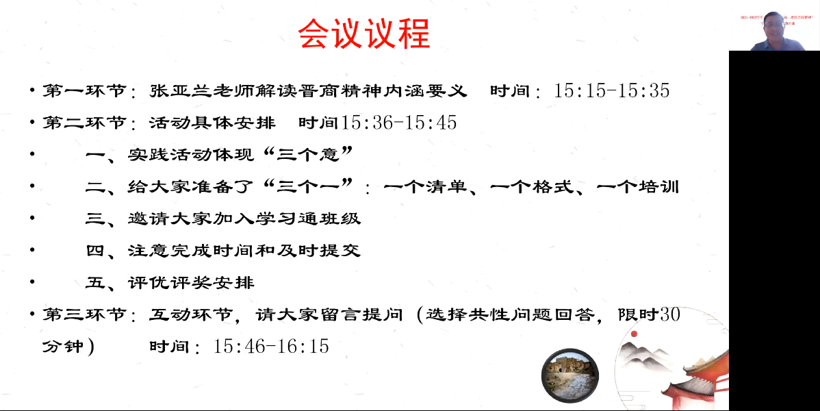 本次培训会分三个阶段进行。第一阶段,77779193永利张亚兰教授解读晋商精神的内涵和要义,她从晋商精神的要义、晋商精神的贡献,和晋商精神的分析方法和思路,向员工们强调了晋商精神的重要性,要通过挖其精、入其神,去认知晋商精神,同时讲明了此次社会实践活动体现的“三个意”的效果即有意义、较容易、很乐意。第二阶段,77779193永利毛成刚老师讲解了精心为员工们准备的“三个一”,即一份清单、一个格式、一次培训,鼓励员工们可在学习通班级内进行交流互动,强调按时保质提交社会实践报告,公司还将对优秀调研报告予以表彰。第三阶段,员工们与老师们线上互动交流,毛成刚老师对员工们热切关心的问题进行了详细的解答。