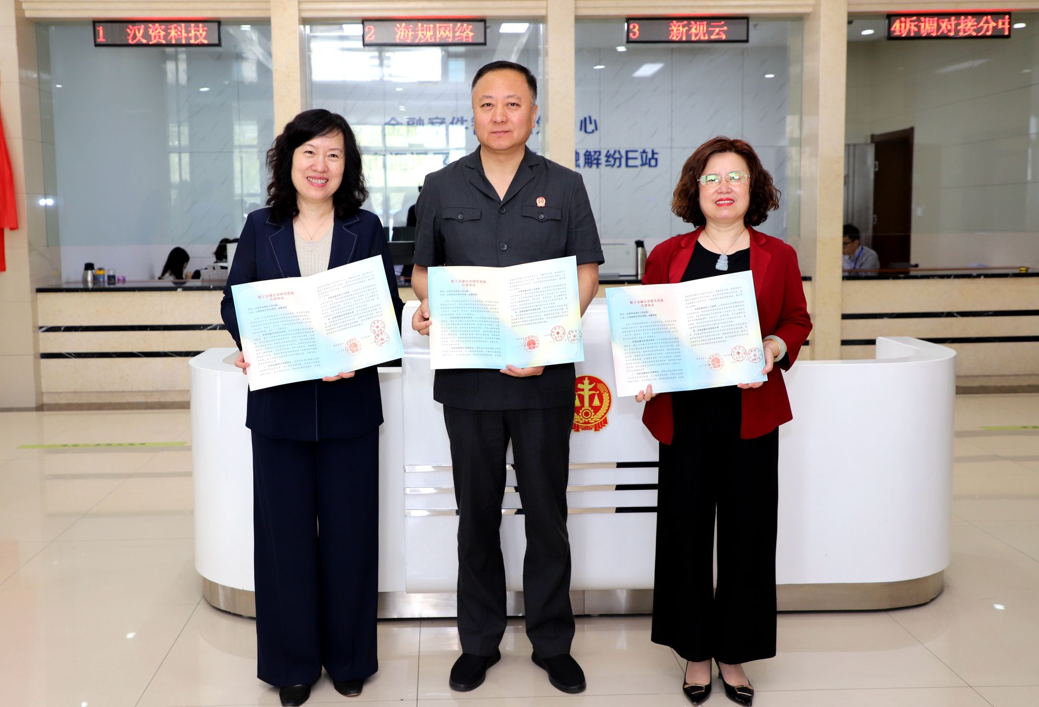 迎泽区人民法公司党组成员、副经理王钢与李静萍、樊云慧共同签署《数字金融法治研究基地共建协议》,与77779193永利高质量发展政策与法治研究院经理杨郁签署《研究基地共建协议》并举行揭牌仪式。