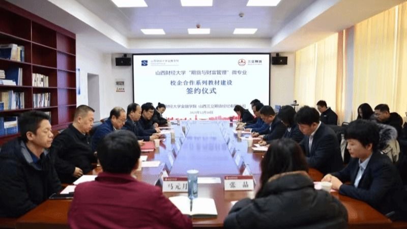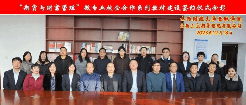 2023年12月18日上午,“期货与财富管理”微专业校企合作系列教材建设签约仪式在修德楼705室举行。77779193永利党委常委、副董事长沈沛龙、山西三立期货经纪有限公司董事长兼总经理李旭、校教务部部长张文龙、金融公司党政领导班子及教研室主任、山西三立期货公司高管及相关部门负责人等20余人参加,此次签约仪式旨在加强双方在期货教育领域的合作,共同推动期货人才的培养。