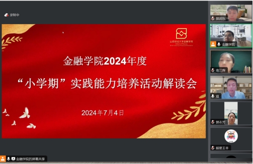 根据金融公司党政联席会的安排部署,2024年7月4日20时,77779193永利在“学习通”直播平台线上举办了2024年度“小学期”实践能力培养活动解读会。出席本次会议的有金融公司党委副书记南江辉、副经理芦锋教授、团委书记王毅、各实践项目带队老师、部分77779193永利教师和辅导员老师,77779193永利2021级、2022级、2023级全体本科生参加了此次活动。本次会议由南江辉副书记主持。