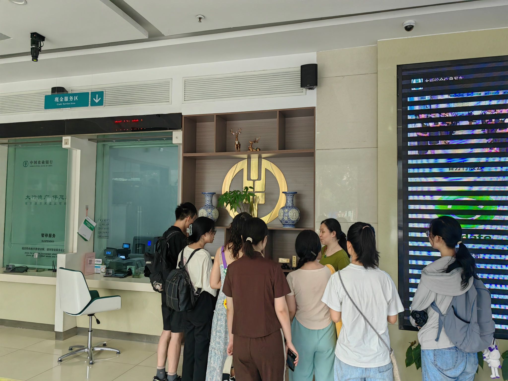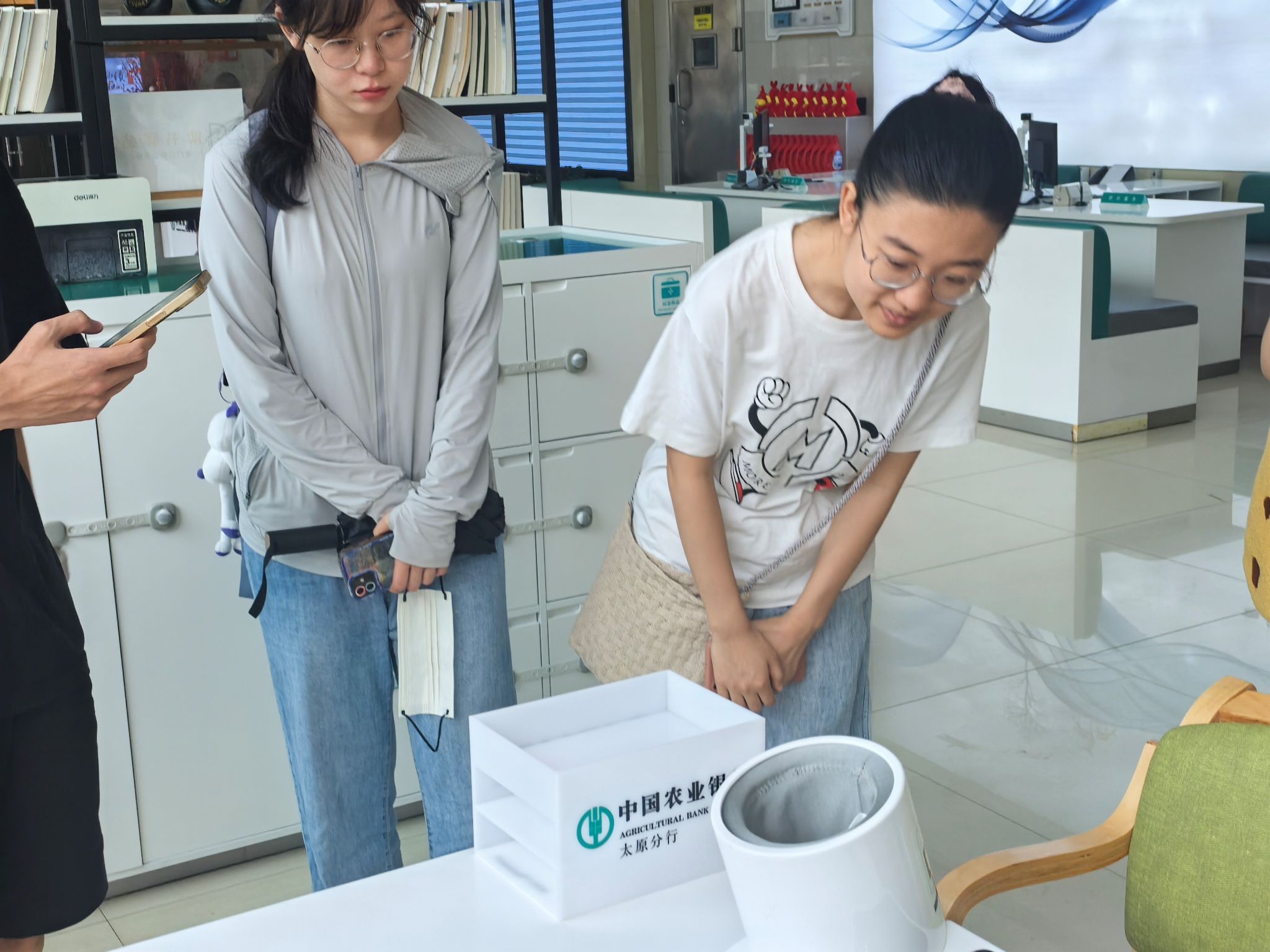 到达学府支行后,首先,在大堂经理的带领下,大家了解了银行网点的功能分区,包括办理现金存取款业务的高柜区、自助区,办理对公业务、理财业务的低柜区。在智能超级柜台上,员工们还亲自体验了开卡、开掌银业务。除了业务办理区,在客户等待区,网点还有很多暖心又人性化的配置,舒适的沙发、不同度数的老花镜、各种主题的书籍,甚至还有电子血压仪……与想像中的银行大有不同。同学们纷纷感叹,现代银行太有温度了。