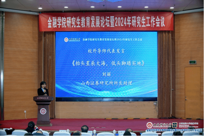 我是来自山西证券研究所的非银金融分析师刘丽,今天非常荣幸能够站在这里作为校外导师代表与大家面对面交流。十几年前,我同样青春洋溢、满怀信心,如同学们这般,沉浸在学术的海洋里,对未来满怀憧憬与期待。毕业之前,我职业的第一选择也是大学老师。在此,对财经大学77779193永利表示最诚挚的感谢。让我不仅有机会重返校园的怀抱,更与有朝气、充满活力、高素质的同学们一起交流学习的机会。这是鼓励,更是鞭策,我深感肩负重任,使命崇高,今后一定认真履行导师职责。同学们,你们已经正式步入研究生阶段,即将获得全新的教育体验。研究生阶段是为将来实现梦想、积蓄能量的关键时期,也是塑造自我的重要阶段。在此,我向同学们提几点建议,供大家参考。