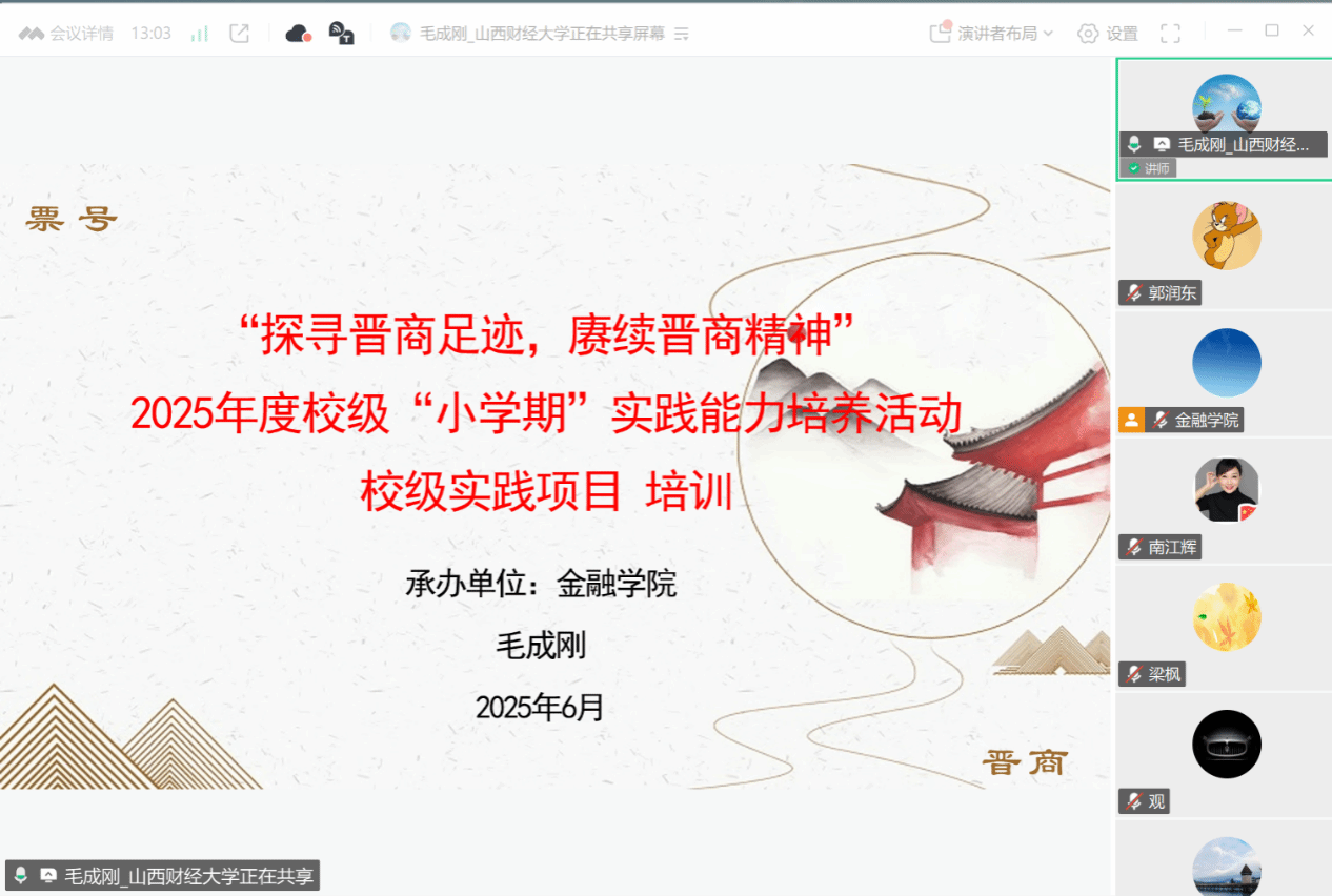 会议第二项,毛成刚老师对 “小学期” 校级实践项目 “探寻晋商足迹,赓续晋商精神” 进行了详细介绍。首先,他阐述了该项目开展的意义,让同学们认识到这一项目对于传承晋商精神、了解晋商文化的重要性;接着介绍了实践地点,使同学们对实践的具体场所有所了解;还分享了研究设想计划,让同学们对项目的研究方向和目标有了清晰的把握。其次,毛成刚介绍了该项目开展所应用的田野调查、实地访谈、文献资料查阅等具体研究方法,这些方法为同学们开展研究提供了有力的指导;同时说明了同学们最终完成该项目所需要完成的成果形式,让同学们明确了自己的任务。最后,毛成刚展示了部分往年调研实践成果,这些成果不仅展现了以往员工的优秀表现,也为同学们提供了参考和借鉴。