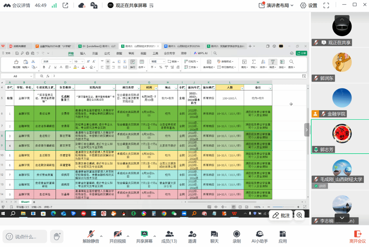 会议第三项,各实践项目带队老师分别介绍了院级实践项目。李志楠老师介绍的 “走进证券” 活动,公司将邀请山西证券专家来校讲座,让同学们学习证券领域的专业知识,同时组织员工参观山西证券投教基地,使同学们能够将理论知识与实践相结合。郭志芳老师介绍的 “走进银行” 活动,公司将请银行专业人士来校分享从业经历,让同学们了解银行行业的实际工作情况,并带员工参观、调研中国农业银行柳南支行,增加同学们的实践经验。李建莹老师介绍的 “走进期货” 活动,公司将邀请三立期货高管来校做专题报告,为同学们讲解期货行业的知识和发展趋势,同时带员工参观三立期货公司,体验交易操作,让同学们更直观地了解期货交易。梁枫老师介绍的 “走进财富” 活动,公司将邀请晋金财富专家来校做专题报告,之后会组织员工到晋金财富公司进行实地调研,让同学们深入了解财富管理领域。张晶老师介绍的 “走进保险” 活动,将邀请太平人寿保险公司高管来校做讲座,之后将带员工参观泛华保险公司,使同学们对保险行业有更全面的认识。张亚兰老师介绍的 “走进红色金融” 活动,公司将邀请马文玉纪念馆馆长来校讲解,之后将带员工参观马文玉纪念馆和故居,让同学们了解红色金融的历史和发展,传承红色金融精神。卞小娇老师介绍的 “走进低空经济” 活动,将分别进行低空经济讲座和实地调研活动,让同学们了解新兴的低空经济领域。